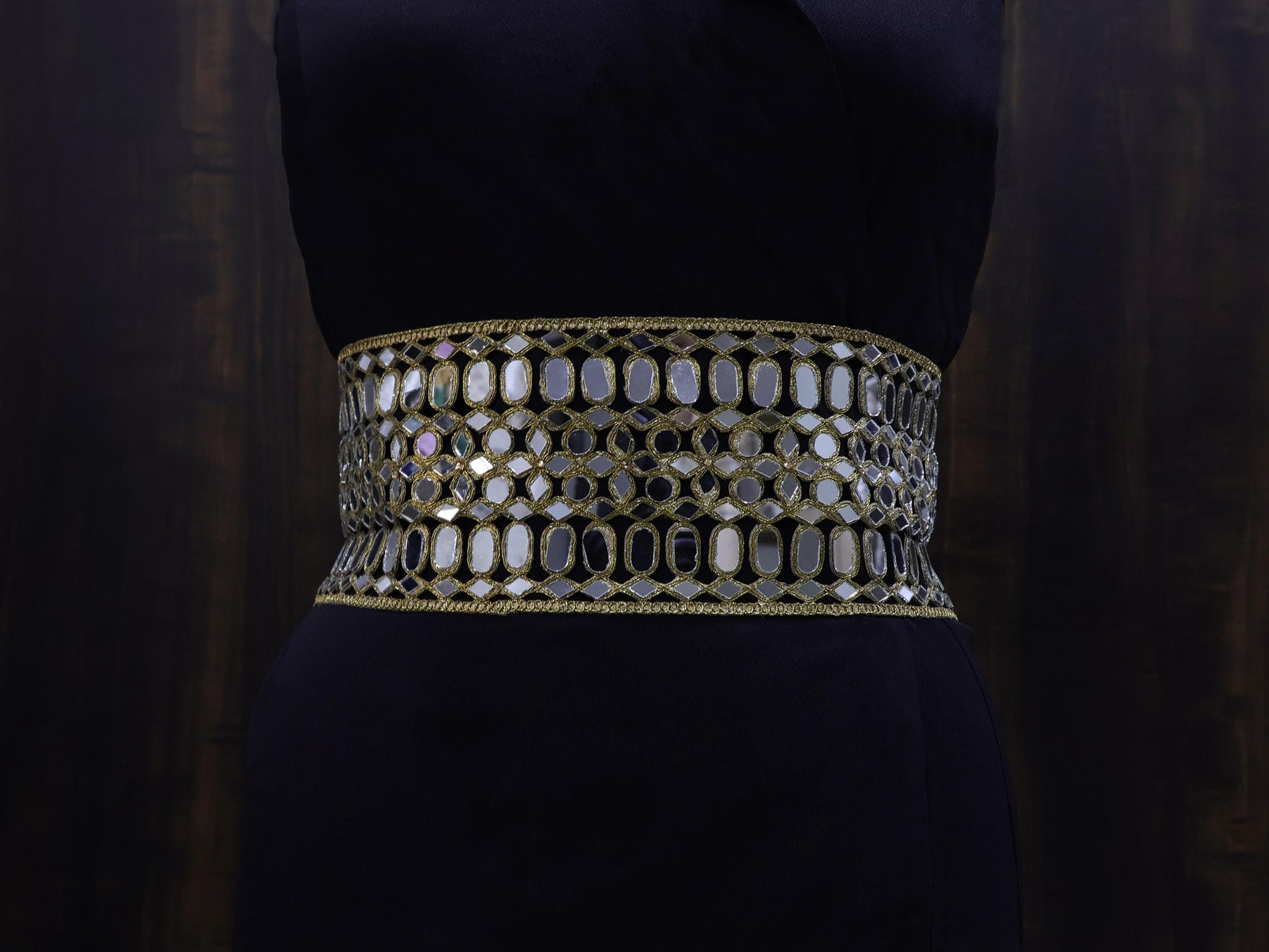 Antique Gold Statement Waist Belt: Mirror Design, Adjustable Chain