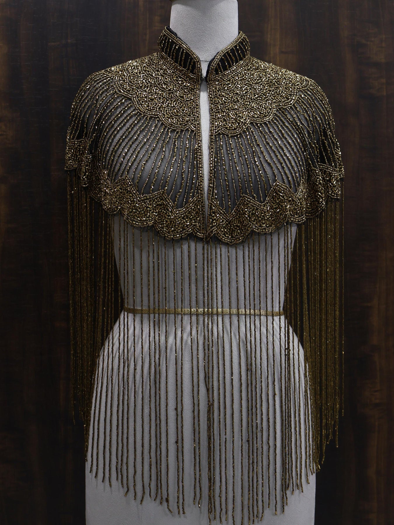 Add a radiant touch of sophistication to your bridal or evening look with this exquisite antique gold and black beaded cape. Designed for modern brides and fashion-forward women, this delicate cover-up drapes beautifully over the shoulders, creating a stunning statement accessory.