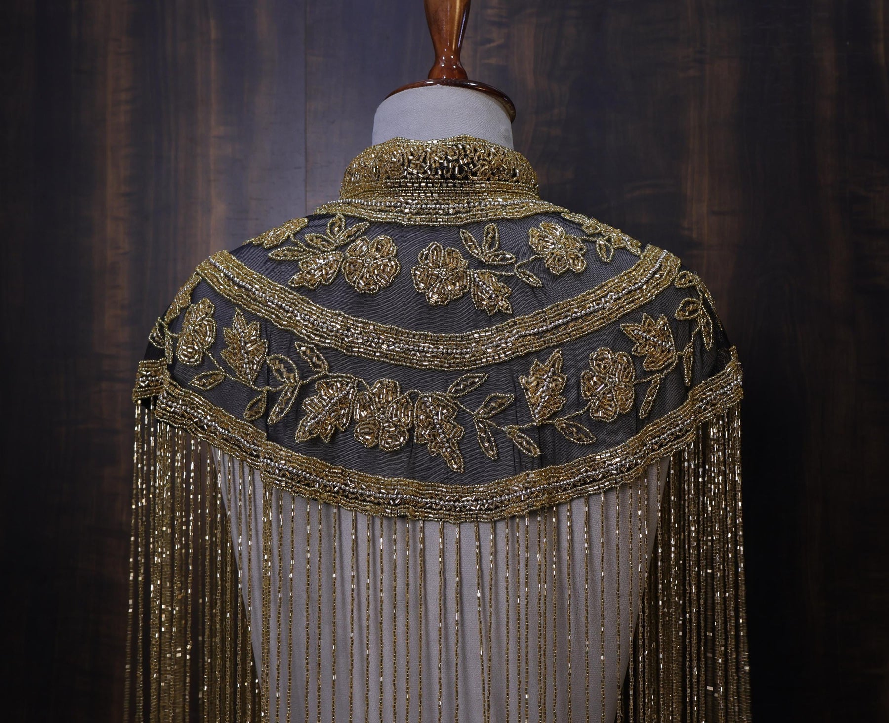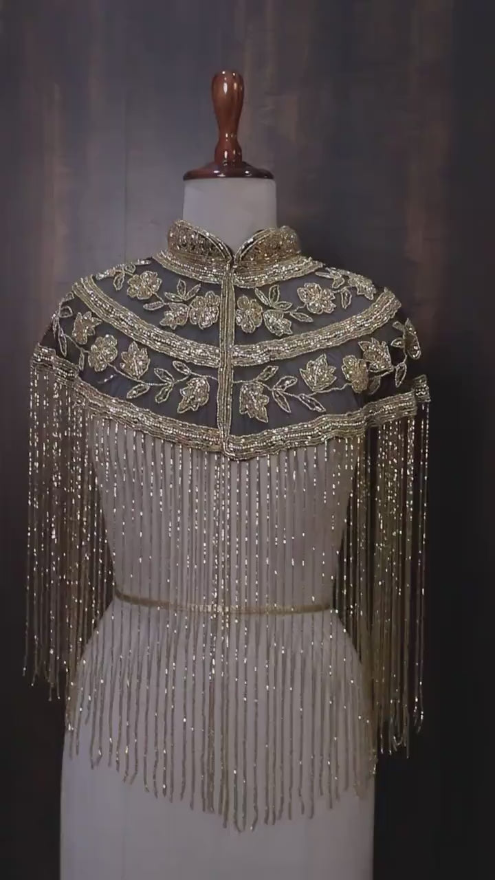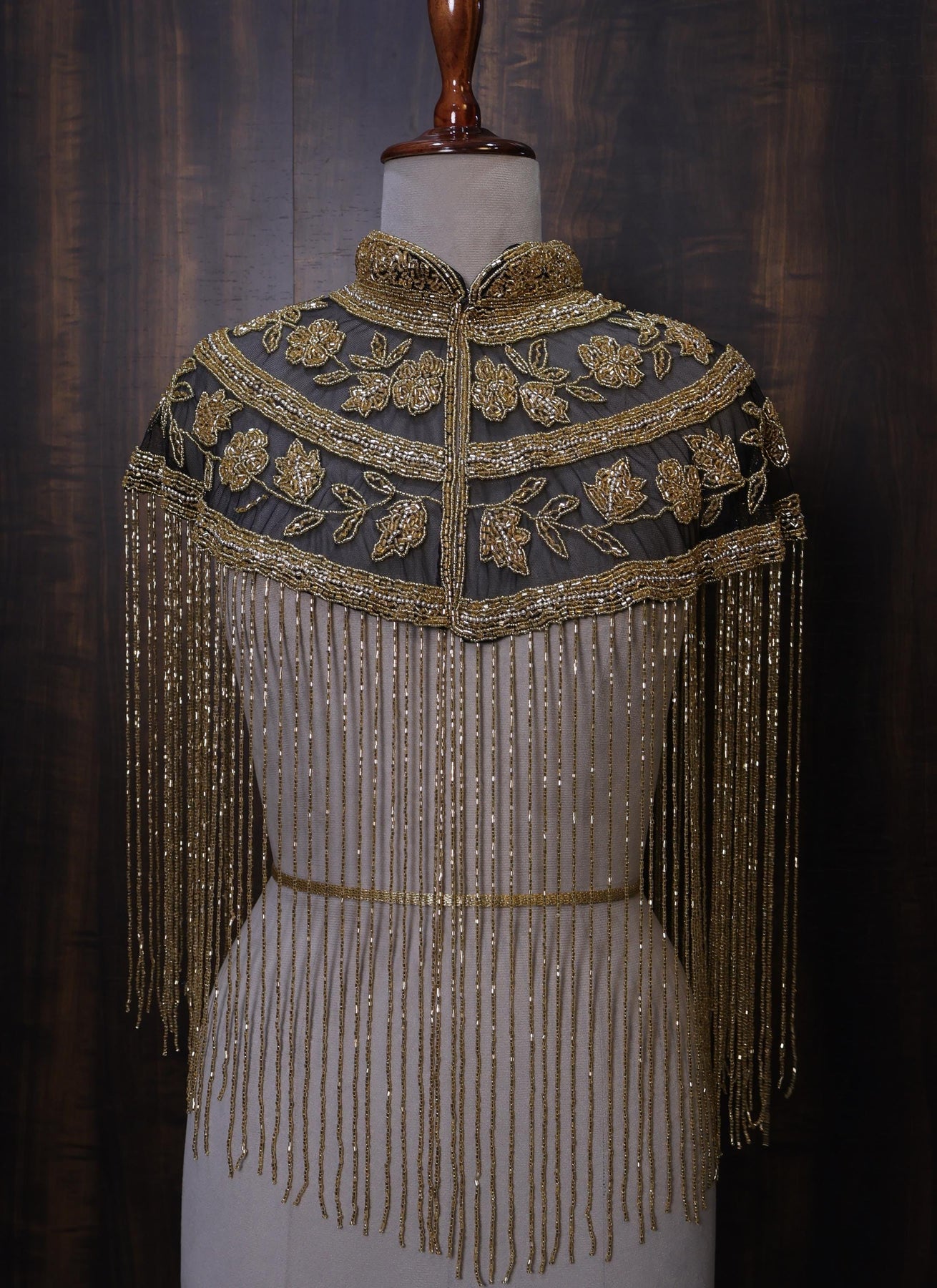 Make a dramatic statement with this Black & Golden Beaded Cape, a luxurious accessory that blends sophistication with artistic handcraft. Perfect for weddings, receptions, or glamorous evening events.