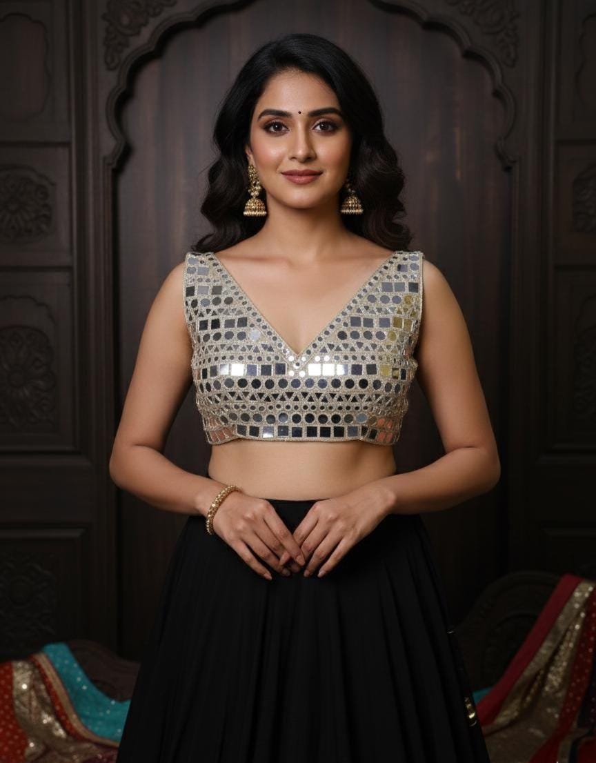 Step into the spotlight with this Gold Mirror Work Sculpted Blouse, a luxurious, hand-embellished piece designed to elevate any festive or evening ensemble. Crafted with precision, this structured blouse features shimmering mirror work, sequins, and fine gold embroidery, offering a radiant, high-impact finish perfect for weddings, cocktails, and party wear.
