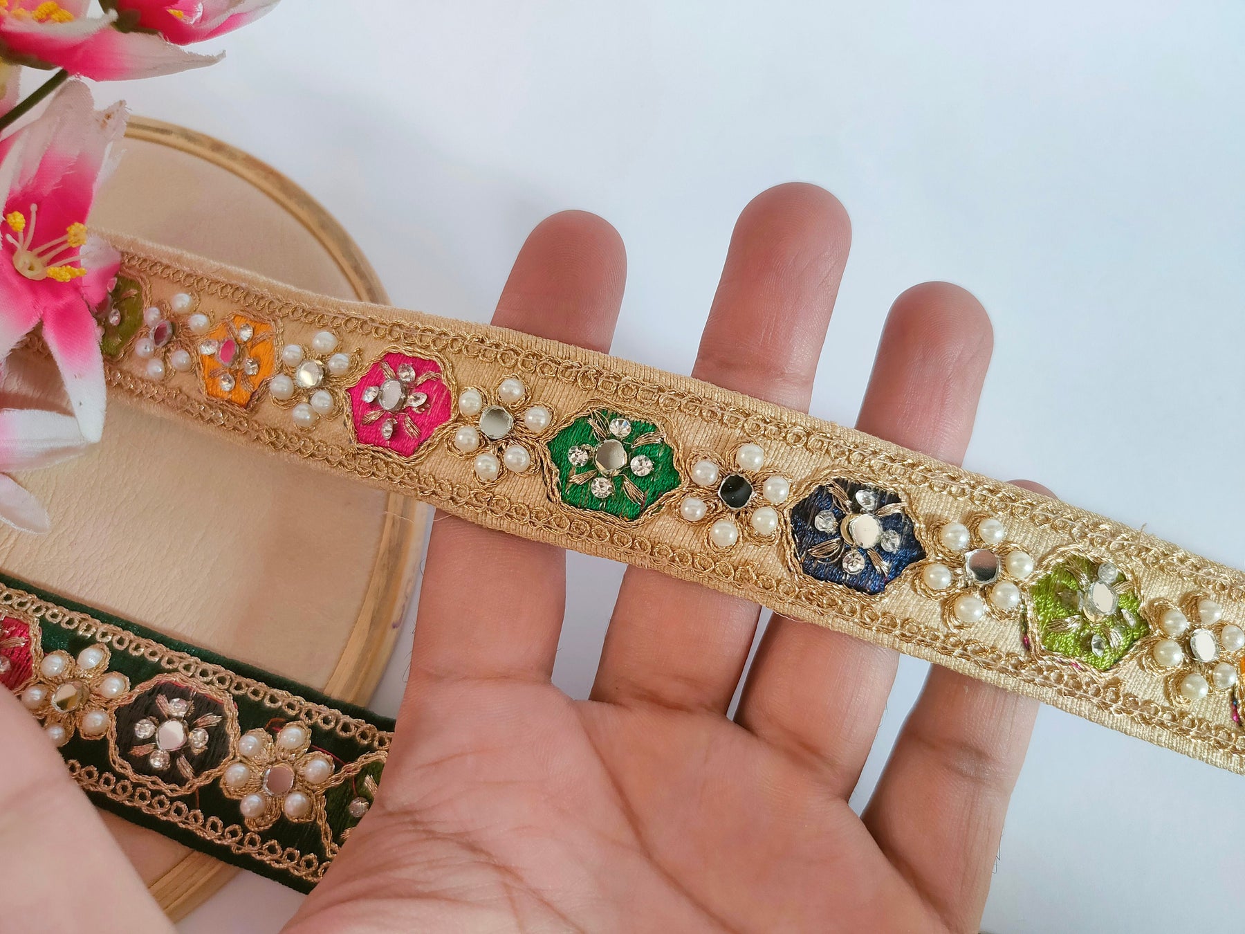 3 Yards Indian Saree Border Lace: Rama Green, Gold, Pearl & Mirror Trim