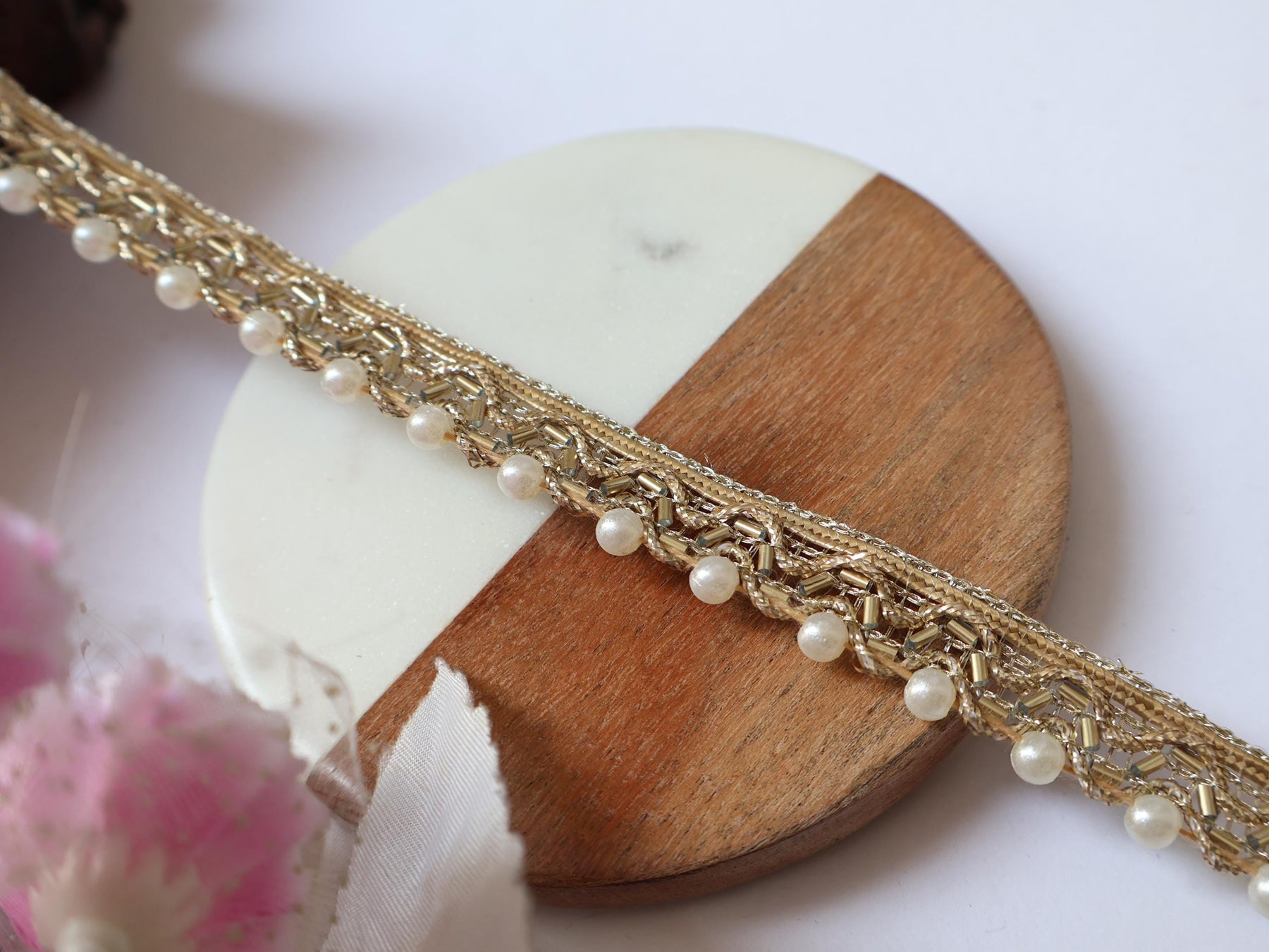 Add a touch of elegance to your garments and accessories with this beautifully handcrafted Pearl & Gold Beaded Lace Trim. Perfect for bridalwear, couture outfits, and festive Indian fashion, this narrow 1.5 cm trim offers subtle shine with a premium finish.