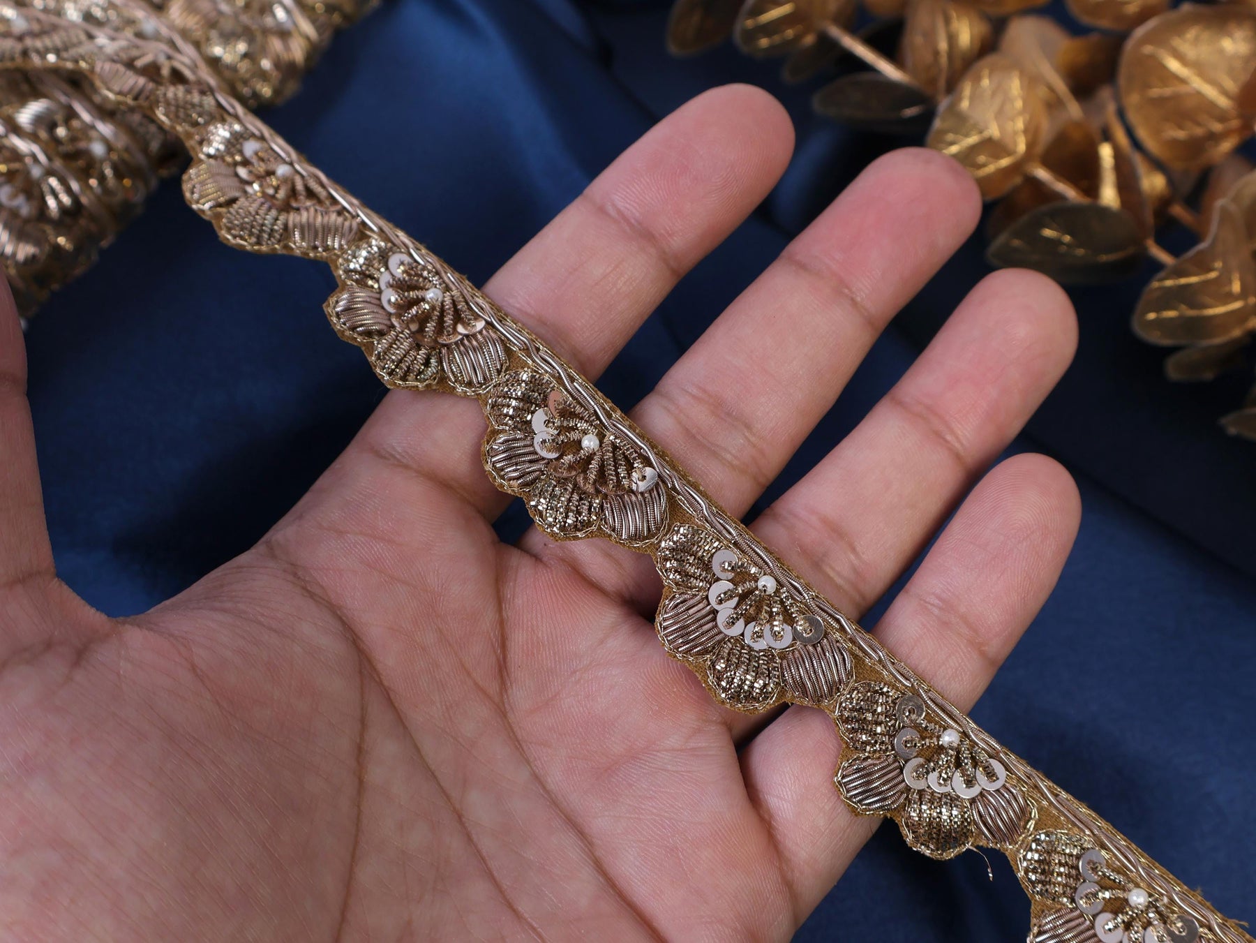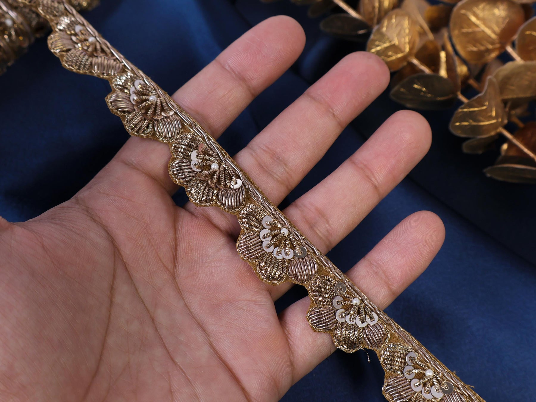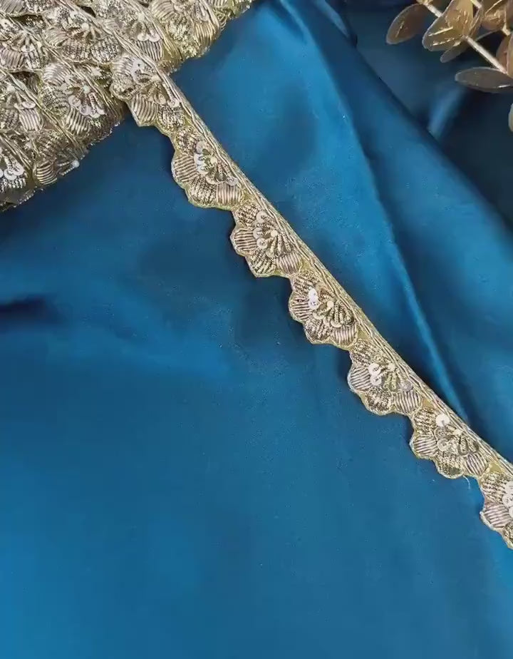 Add timeless elegance to your creations with this antique golden Zardozi hand-embroidered lace trim. Featuring intricate metallic threadwork, this 2.5 cm wide border is perfect for giving a regal finish to Indian wear, gowns, accessories, and couture pieces.