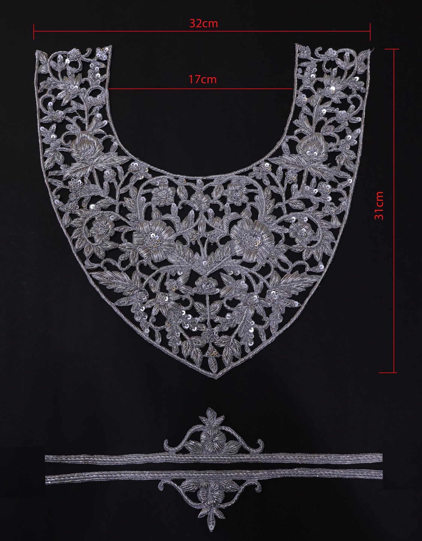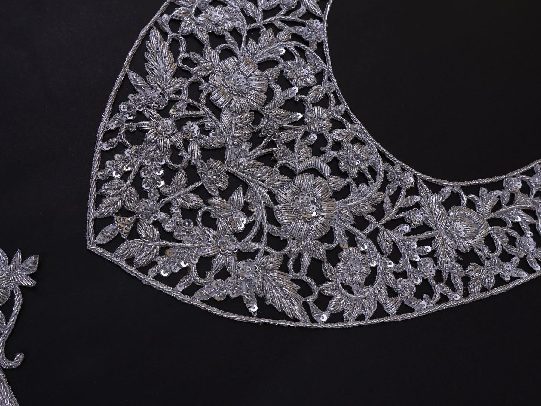 Bring timeless elegance to your creations with our Metallic Silver Luxury Zardozi Embroidered Neckline Sew-On Patch with Sleeves. This handcrafted Indian patch set is a stunning embellishment for DIY sewing, ethnic wear, and custom fashion projects.