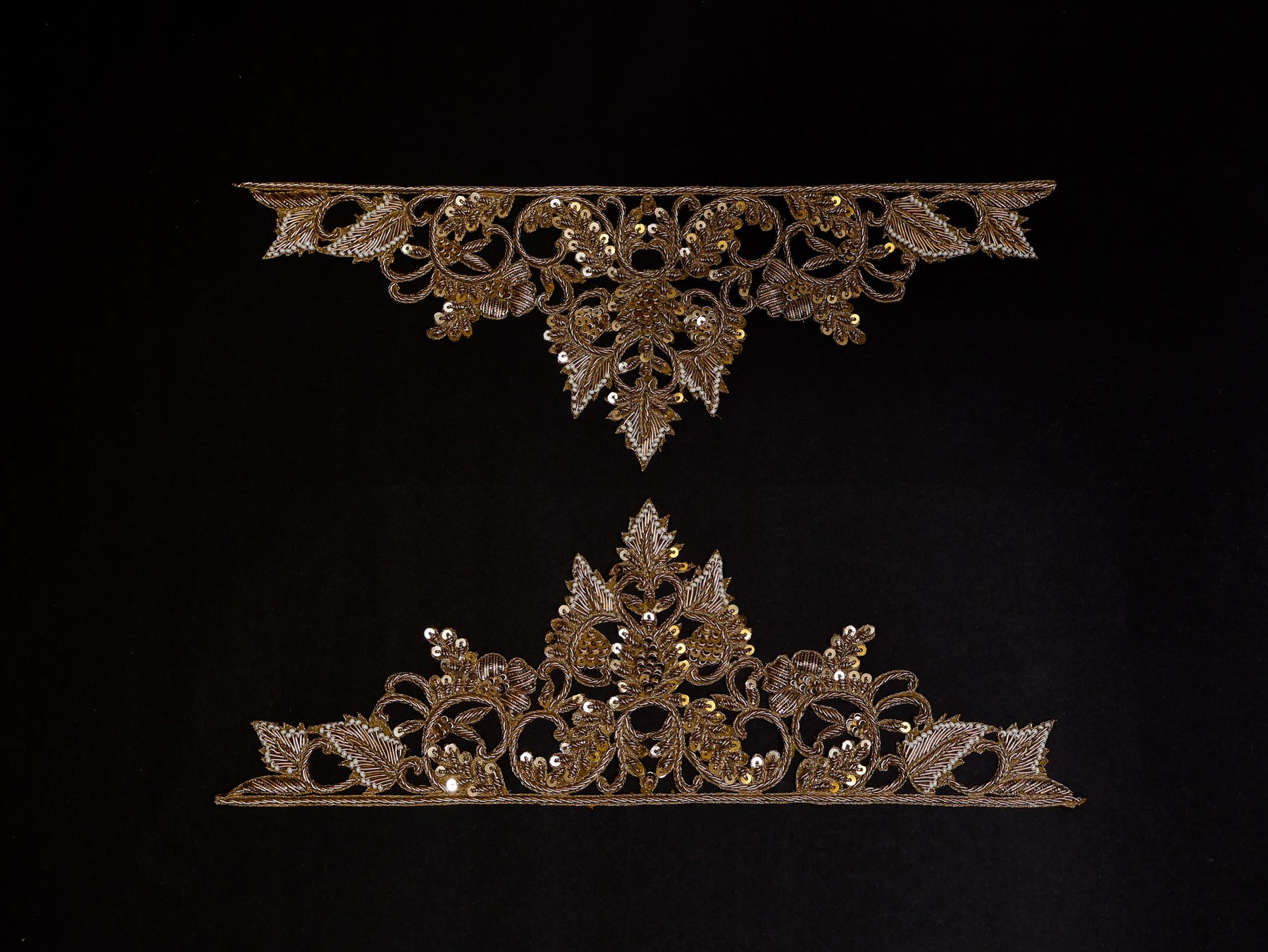 Add a regal touch to your garments with this pair of Exquisite Antique Gold Zardozi Sleeve Patches, beautifully handcrafted using traditional Indian embroidery techniques. These ornate sew-on appliques are perfect for enhancing the sleeves of kurtis, jackets, lehengas, and festive outfits, or for use in DIY couture and decoration projects.